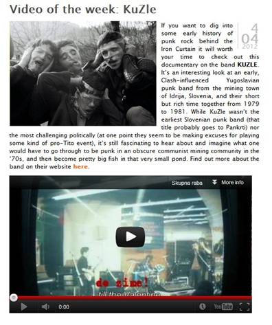 Pretekli teden je namreč dokumentarec o KuZlah, režiserja Matjaža Mraka in Robija Šabeca, postal ‘video of the week’ ameriške glasbene revije Maximum Rocknroll. Dokumentarec, ki je bil pred kratkim premierno predvajan tudi na naši nacionalki, pa je sedaj v neskrajšani verziji dostopen tudi na www.kuzle.si.